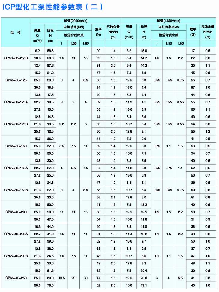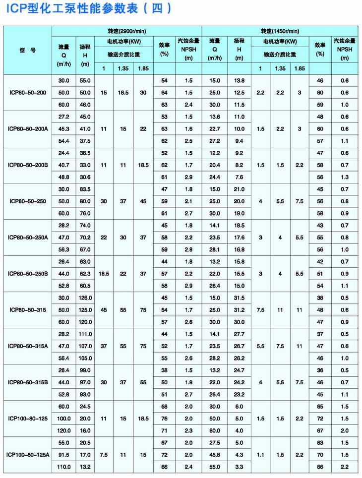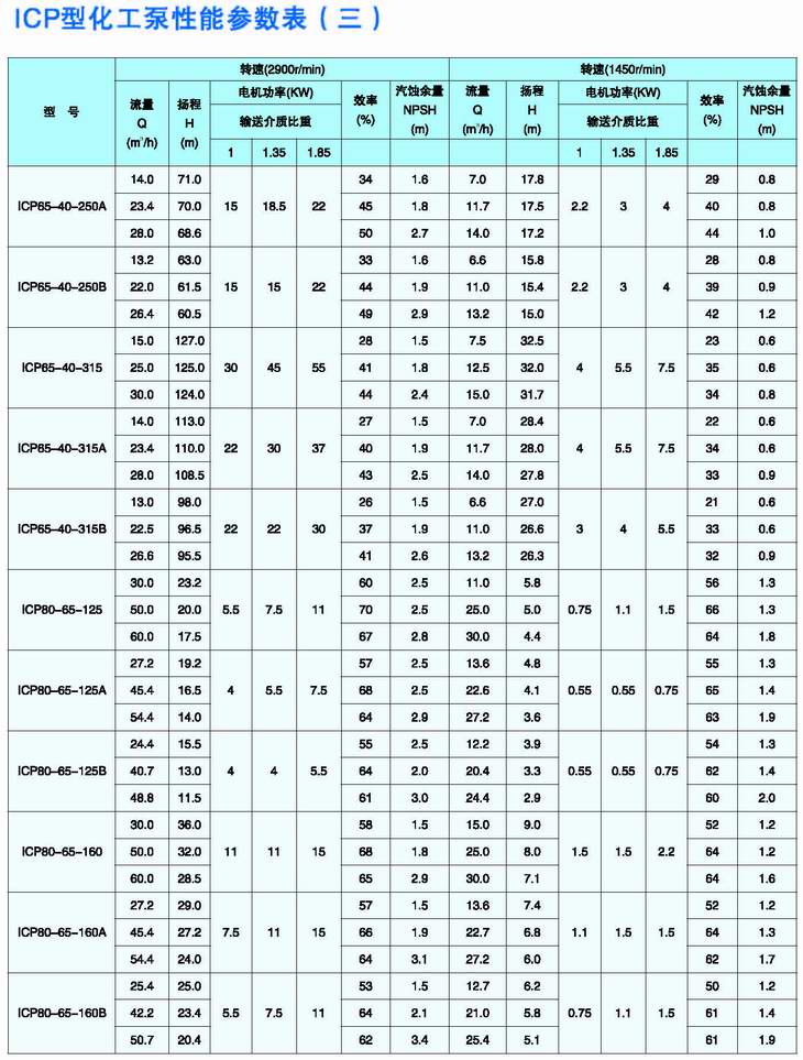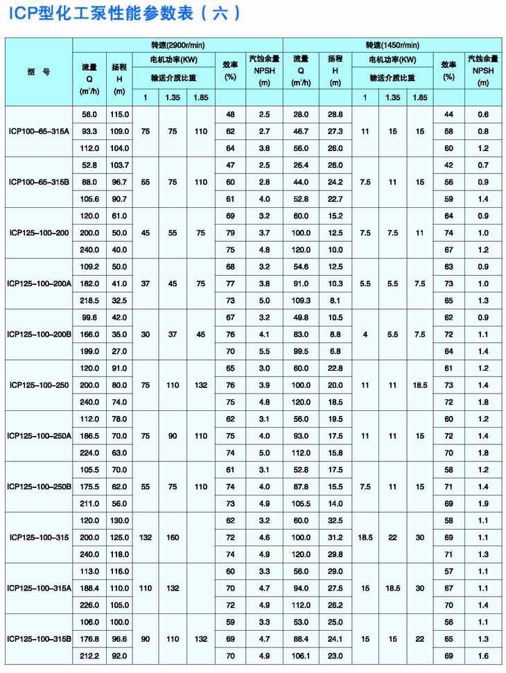 ICP型化工泵是綜合國外幾家著(zhù)名公司九十年代最新開(kāi)發(fā)的化工泵結構而設計的新一代化工流程泵,可與IH型泵和瑞士蘇爾壽公司CZ型化工泵互換,其運行極為可靠。根據用戶(hù)輸送介質(zhì)的不同,泵的過(guò)流部件材料有氟塑料、搪玻璃、各種奧氏體不銹鋼、金屬鈦、金屬鎳等,因此可廣泛用于輸送低溫、常溫或高溫腐蝕性介質(zhì),并允許含有一定量的固體顆粒,主要應用于化工、石油化工、煉油、冶金、輕工、醫藥等工業(yè)部門(mén)。 |